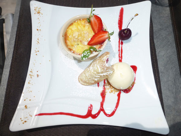 For starters, you can for example select the homemade Duck Foie Gras half cooked in cloth, with fig chutney or the Green Asparagus with Parmesan or the marinated Artichoke and Goat Cheese cream with chives. To continue, a tender fillet of Simmental beef “à la plancha” or a delicious Filet Mignon of Veal with Morel sauce or the flavors of the sea with a seared St Pierre fillet deglazed in Lemon. The desserts are sumptuous and artfully presented like the Fine Apple pie, gingerbread ice or the Cherry Clafoutis.