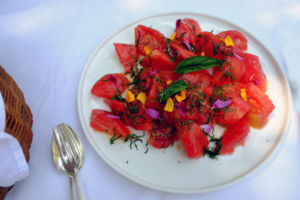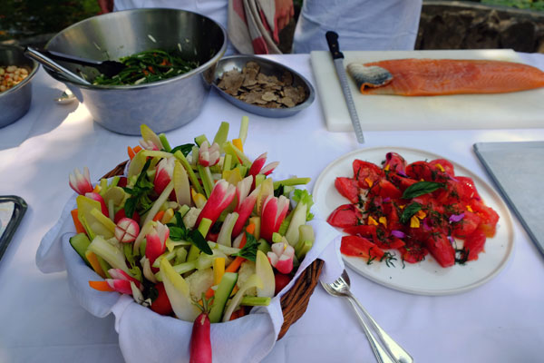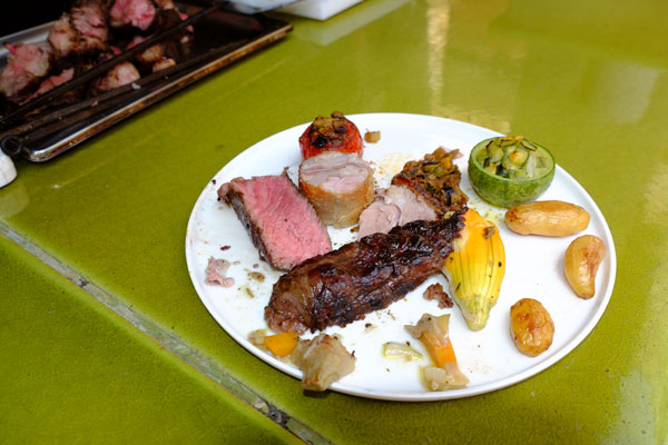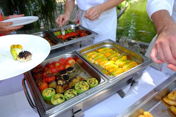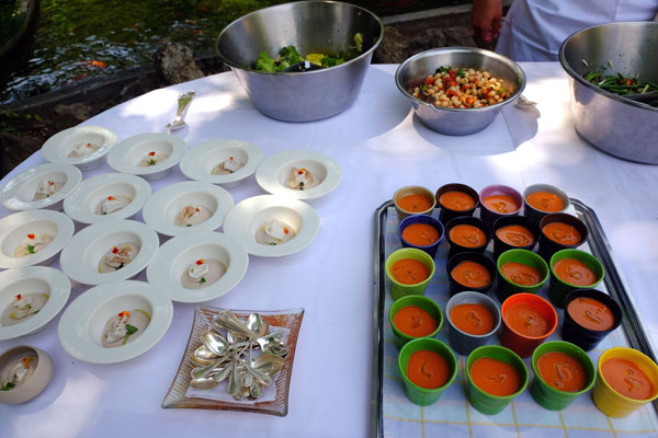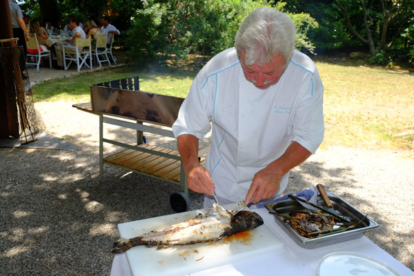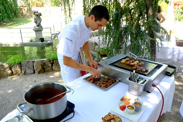 The guests of the Garden Party could taste many dishes cooked in the spirit of Restaurant Le Castellaras: market cuisine, with the seasonal excellent fresh local produce or local fishing, beautifully elaborated or cooked at heart. For starters, salads made from fresh tomatoes with basil, Foie Gras, sublime burgers with Foie Gras, a gorgeous Fish Soup with its croutons and Rouille, gazpacho and other entrées. The meal continued with barbecue specialties: juicy quail, large sea bass, large prawns, Côte de Boeuf, grilled “andouillettes”… accompanied by sun-drenched vegetables and stuffed vegetables, including delicious stuffed zucchini flowers. And even the less gourmands had kept some room for desserts.