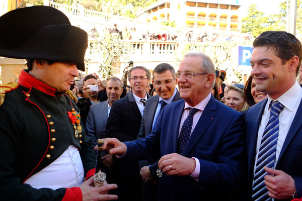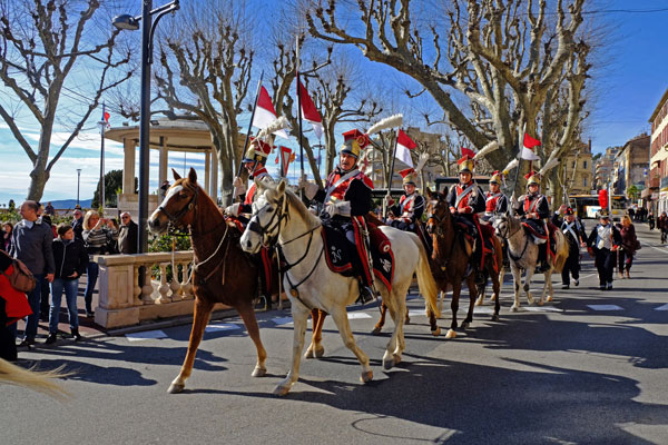 The cavalry and infantry made their triumphal entry into Grasse on the Honoré Creps Course. There, a large crowd welcome them with cries of “Vive l’Empereur!”. The procession then went up the Jeu de Ballon boulevard to finally stop Place de la Foux. Mayor of Grasse Jérôme Viaud offered them a small bouquet of violets before wishing the Emperor good way to glory.