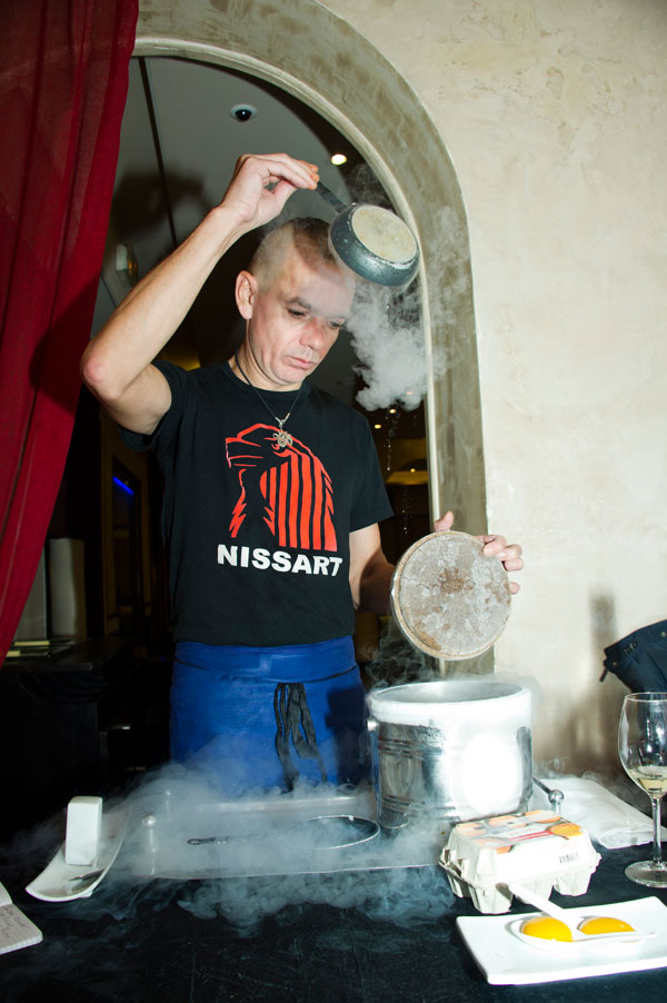 Noëlle Cornu-Faure is again the charming ambassador of the new culinary techniques: the on the spot Sorbet with Pear Compote iced by Liquid Nitrogen. This very cold gas changes the molecular structures of the natural product, exalts the fragrances and offers a creamy sorbet with no flake of ice. The pure airy delight brings freshness and softness to the palate!