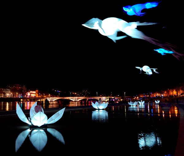 The Lumineoles are poetic light structures 15 meters long, driven on the Water Mirror by manipulators installed inside large bright lilies.