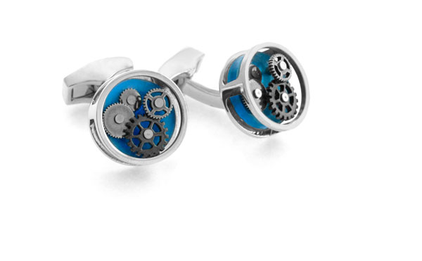 After the success of the Tateossian Gear cufflink, the Gear Perspex cufflink makes its debut to the Duty Free market. Vibrant blue Perspex set against multicoloured gears in various sizes framed in a round casing.