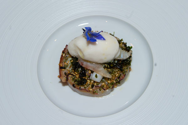 Amuse Bouche: Lobster and octopus with smoked eel, Yuzu juice ice.