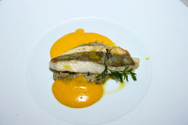 Le Saint Pierre, “cuit au naturel”, eggplant caviar with coriander, cumin and carrot sabayon.