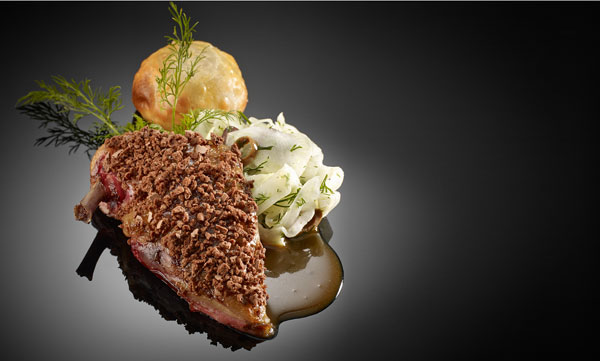 Pigeon du Chapon Bressan with big chocolate macaroon, thigh in Pascaline tourte, fennel and olives taggiasche.