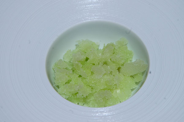 Pre-dessert: Espuma of Yuzu lemon, candied strawberry and jasmine, basil granité.