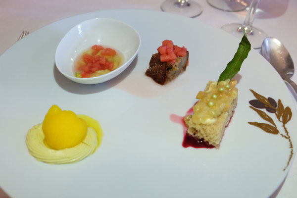 La Noix de Biche à la Royale sur sa Grassoise d’Aubergine, Mousseline de Patate Douce à l’Orange