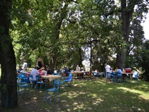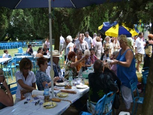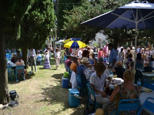 After the stock dance, people sat at tables to enjoy the conviviality of the traditional picnic under the shade of trees.